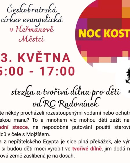Přijďte si užít odpoledne a aktivity pro rodiny s dětmi u příležitosti Noci kostelů. Zastavte na zahradě Sborového domu ČCE, Zahradní 537 v Heřmanově Městci, kde bude otevřená tvořivá dílna a stezka Naděje.
