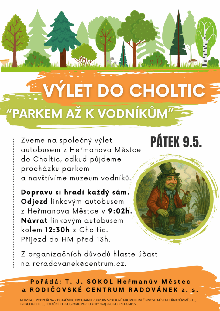 T. J. Sokol Heřmanův Městec a spolek Radovánek zve na společný výlet do zámeckého parku a do muzea vodníků. Odjezd linkovým autobusem z Heřmanova Městce v 9:02h, návrat kolem 12:30h, příjezd do HM před 13h. Dopravu i vstupné si hradí každý sám. Z organizačních důvodů hlaste svou účast na rcradovanek@centrum.cz.