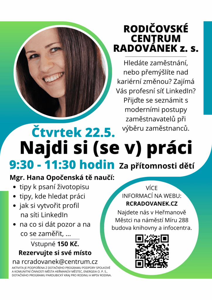 Hledáte zaměstnání, nebo přemýšlíte nad karierní změnou? Zajímá Vás profesní síť LinkedIn? Přijďte se seznámit s moderními postupy zaměstnavatelů při výběru zaměstnanců. Mgr. Hana Opočenská tě naučí: tipy k psaní životopisu, kde hledat práci, jak si vytvořit profil na síti LinkedIn, na co si dát pozor a na co se zaměřit. Vstupné 150 Kč. Rezervujte si své místo na rcradovanek@centrum.cz.