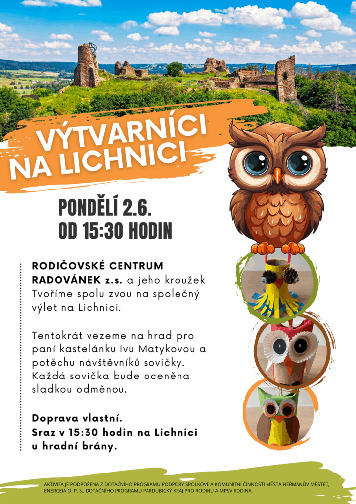 S kroužkem Tvoříme spolu zveme na společný výlet na Lichnici. Tentokrát vezeme na hrad pro paní kastelánku Ivu Matykovou a potěchu návštěvníků sovičky. Každá sovička bude oceněna sladkou odměnou. Doprava vlastní. Sraz v 15:30 na Lichnici u hradní brány.