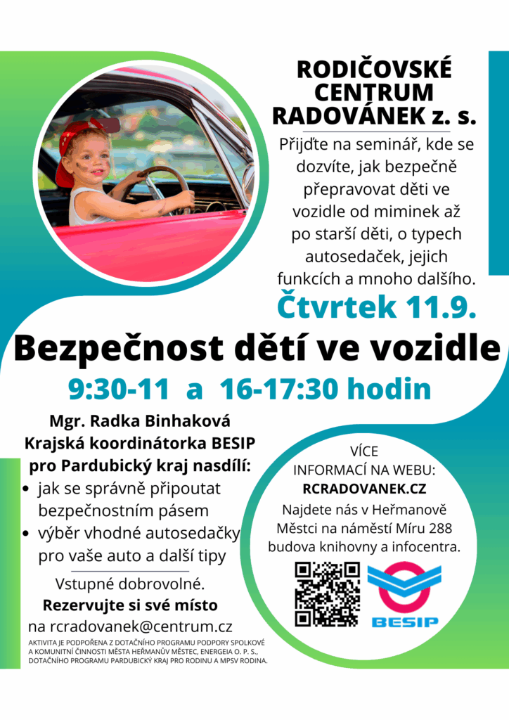 Přijďte na seminář, kde se dozvíte, jak bezpečně přepravovat děti ve vozidle od miminek až po starší děti, o typech autosedaček, jejich funkcích a mnoho dalšího. Mgr. Radka Binhaková krajská koordinátorka BESIP pro Pardubický kraj nasdílí, jak se správně připoutat bezpečnostním pásem, výběr vhodné autosedačky pro vaše auto a další tipy. Dobrovolným vstupným přispíváte na provoz Rodičovského centra Radovánek. Rezervujte si své místo na rcradovanek@centrum.cz