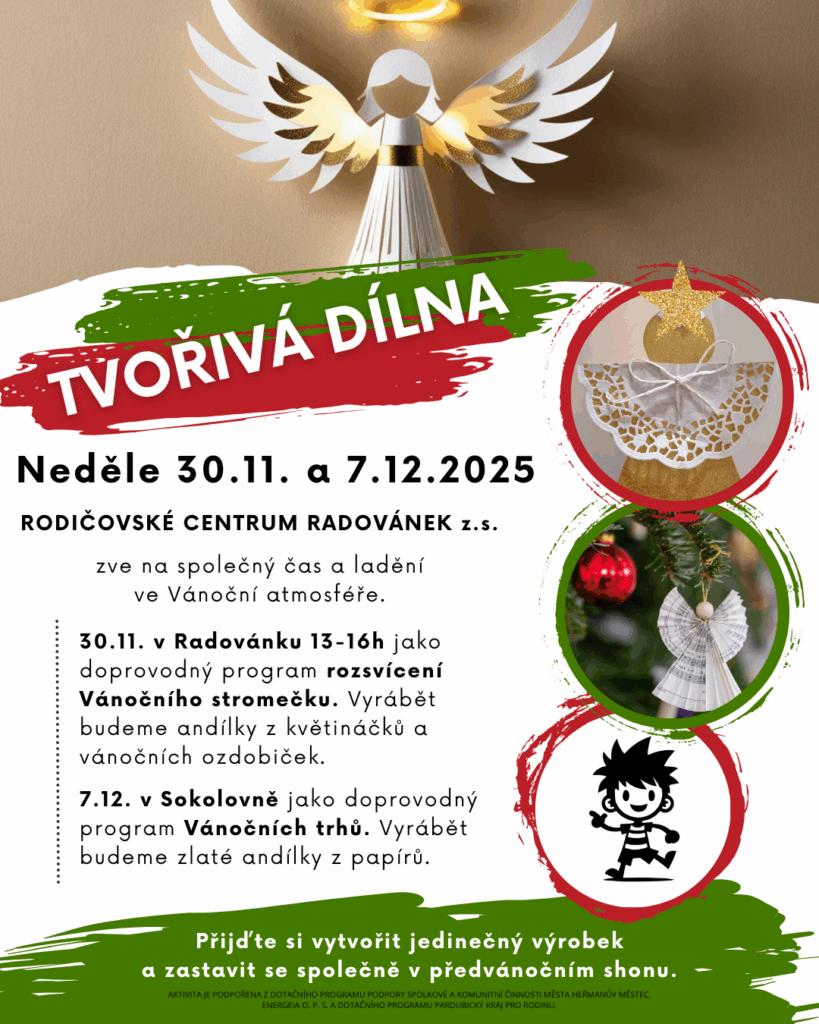 Zveme na společný čas a ladění ve Vánoční atmosféře. 30.11. v Radovánku 13-16h jako doprovodný program rozsvícení Vánočního stromečku. Vyrábět budeme andílky z květináčků a vánočních ozdobiček.